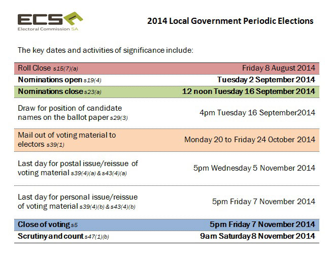 Local Government elections will commence in late October and close on the 7th of November (see schedule to the right, courtesy of the LGA’s web site). Although the PortBUG maintains a non-partisan political stance, we are certainly interested to hear from candidates that share our concerns about improving conditions for active mobility and bicycle use.
