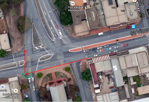 4. St Vincent Street Bike Lanes: In our last blog post the breaking story was news of new bike lanes and crossing facilities being installed on St Vincent Street, Port Adelaide. The PortBUG subsequently wrote to DPTI requesting that the project consider options for reducing hazards that bike users face when turning right from St Vincent Street in Nelson, a manoeuvre required to cross the Birkenhead Bridge, either on the roadway or via the off-road shared-use path. The BUG considers this a major safety issue, particularly for commuting cyclists returning home to Penninsula suburbs late in the day when the setting sun often presents particular difficulties for drivers behind them, negotiating what is a relatively complex set of turning lanes. In particular we asked that DPTI consider inclusion of a ‘hook turn’ facility (similar to that illustrated below) in the current project.