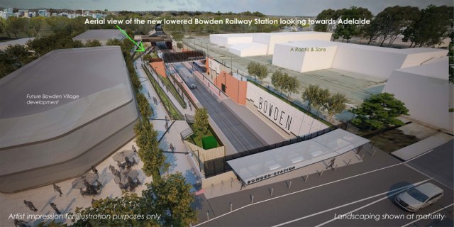 Artist’s view of the Greenway path through the Bowden Station precinct – from the East St crossing.