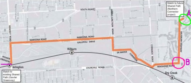 The GG route will proceed on towards Mawson Lakes from ‘B’ above. The linkage to the NC proceeds along the Sals Highway to the NC Bikeway via point ‘A’.