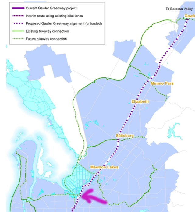 - The Gawler Greenway: The Gawler Greenway route is now more or less determined between the CBD and Mawson Lakes/junction with the Little Para Bikeway. The route will utilize Davenport Tce + shared path to Islington Railway Station (or alternate connection via Pym St and Janice Jensen Reserve), north of which is a proposed new extension via an off-road path along Regency Rd and thence to Narweena Drive for a substantial portion of its length. It will make use of some SA Water reserve as well. The bikeway will be constructed by DPTI but an in-kind will be needed by PA/E Council (principally a new footpath along Narweena Drive) and to ensure their long-term custody and maintenance of the asset. A link will also proceed under the PREXY (existing culvert) to connect to the Northern Connector Bikewaywith contracts for construction already in place.