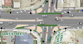 The Hart Street Project is part of DPTI’s ‘Streets for People’ program, based on principles drawn from the ‘Streets for People: Compendium for South Australian Practice’. The Project is illustrated in some detail in the 3 plans and the cross-sections below. Readers will note that for bicycle users in particular there are some interesting innovations: