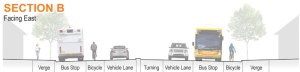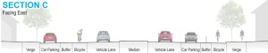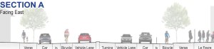 Cross-section at the ‘A’ line above. This is just west of the existing light-controlled school crossing adjacent to the High School.