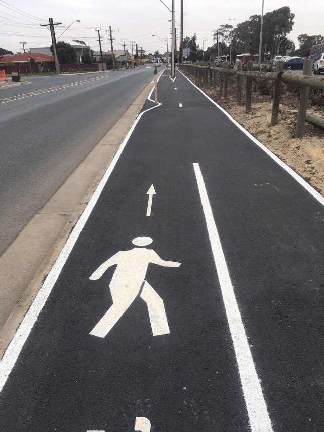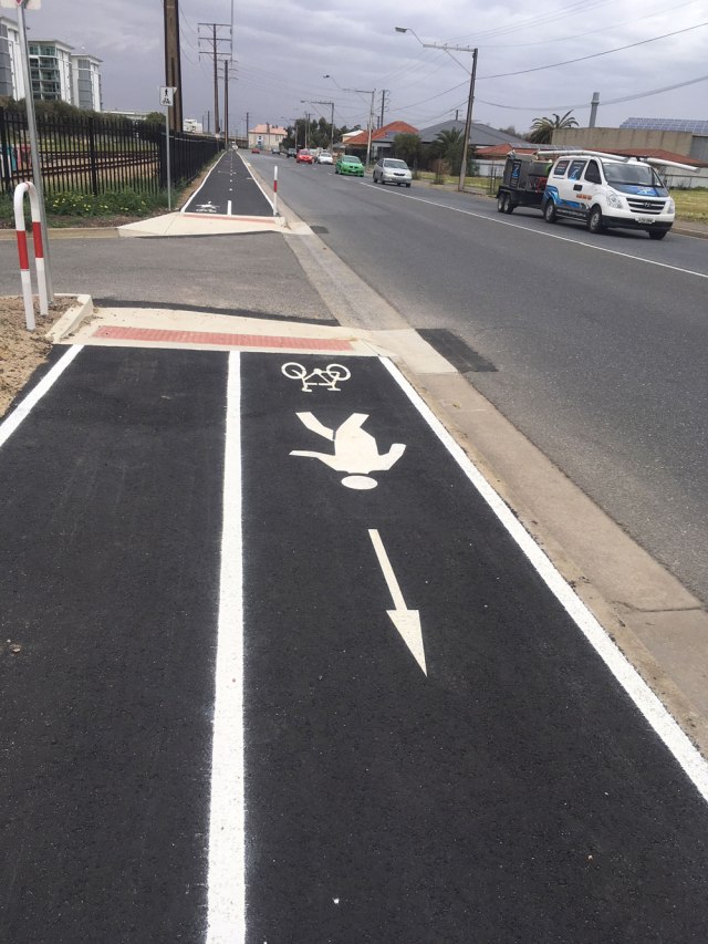 1. Causeway Road, Semaphore. This extremely busy designated freight route runs through the middle of Semaphore and Port Adelaide’s residential areas. It features primary schools at both ends, two rail stations with associated pedestrian crossings, a pub and access to several residential streets! It has no on-road bike facilities (no bike lanes, no lowered speed limits etc). Council has long planned a series of linked off-road bike pathways providing continuous bicycle access the full length of Causeway Road. And we’re pleased to now see these facilities in place! The new works include a new protected crossing adjacent to the Glanville Hotel and links to the Semaphore Road bikeways, the Outer Harbor Greenway, the Harbour Loop path and (at the southern end) to Charle Sturt’s off-road pathways along Old Port Road and through to Semaphore Park and West Lakes. These new pathways are a welcome addition to the growing Port Adelaide/Enfield Bike Network!
