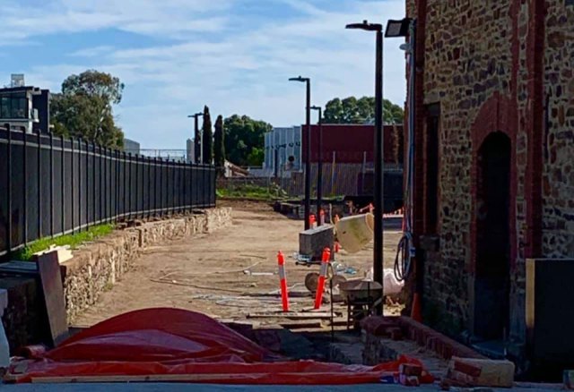 The new pathway route (dotted green line) being built along Drayton St & through the Retort House development site, Bowden.