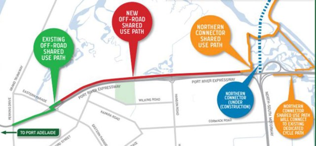September 2018 “The new off-road path will connect the existing path off Eastern Parade in Port Adelaide to the Northern Connector path. It will run side-by-side with the Port River Expressway and is expected to be completed by the end of 2019. Once it is up and running, cycling on the Port River Expressway between Port Adelaide and the Superway will be banned… It will connect to the new Northern Connector [NEXY] Bikeway as well as the Gawler Greenway so it will provide connectivity to Salisbury as well as Gawler and to suburbs along the way such as Mawson Lakes etc.”