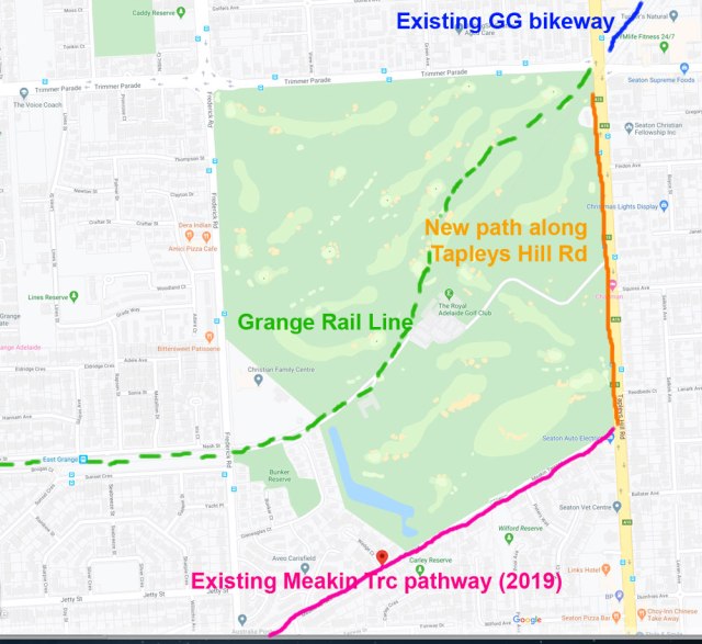 From CCS: ‘The City of Charles Sturt are currently constructing an off road path on Tapleys Hill Road that will form part of the Grange Greenway. The Grange Greenway is a strategic walking and cycling route that follows the Grange Railway Line. As the railway line traverses the Royal Adelaide Golf Course, the Grange Greenway walking and cycling route is detouring around the Golf Course [Ed; along the western side of Tapleys Hill Road].