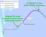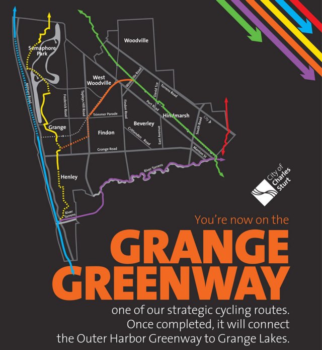 ‘network’ image above. A ‘Grange GreenLink’ bikeway was first outlined in PortBUG’s original proposal for an Outer Harbor ‘GreenLink’ in 2005. We hoped that it would follow the rail line through the Grange Golf Course precinct – but this has not proved possible. The route under construction is shown in orange on the map above, connecting to the Outer Harbor Greenway (green) and the Lakes Bikeway route (yellow). This new Greenway will complement and connect to current and future bikeways within Port Adelaide/Enfield’s Bike Network.