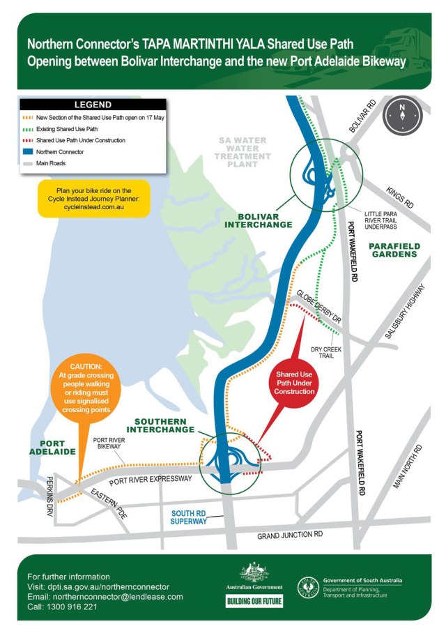 “The second section of the Tapa Martinthi Yala Shared Use Path which runs alongside the Northern Connector motorway, between the Bolivar and Southern Interchanges, will open on Sunday, 17 May, connecting and also opening the new Port River Bikeway. This complements the first section of the Tapa Martinthi Yala which opened between the Northern and Bolivar Interchanges last month.