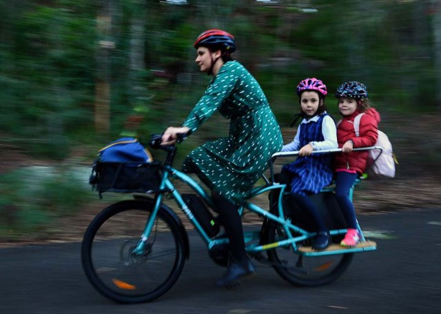 “With a basket on the front of her bicycle and two daughters and school bags weighing down the back, Melissa Derwent cops “surprised looks” as she pedals up and down the steep hills of suburban Oatley to school drop off before starting her commute. There is no Lycra in sight.”
