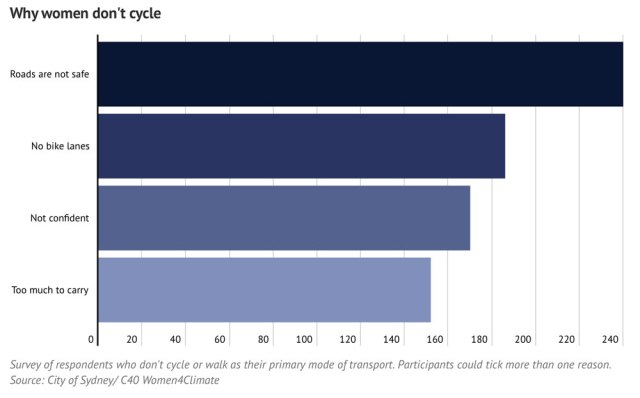 The survey of nearly 900 women was conducted by the City of Sydney council with the global group C40 Women4Climate to address the barriers female walkers and cyclists faced… it recommends every street should be thought of as a “walking and cycling space” and calls for lower speed limits, and separated bike and walking paths.”