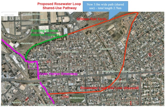 Early this year the Port Adelaide/Enfield Council unsuccessfully sought support from the State Bicycle Fund to build the Rosewater Loop Bikeway, a proposal to connect residents of Rosewater, Ottoway and maybe Wingfield into the Outer Harbor Greenway & Port CBD by upgrading a disused rail line and an informal pathway in the Gillman reserve.