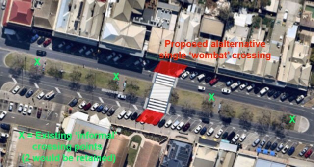 The ‘wombat’ crossing option addresses the majority of issues raised in the consultation process (loss of parking and the vehicle speeds) and still allows a crossing point for the less able and others to cross Semaphore Road. Two of the informal crossing locations would be retained (where pedestrians would not have right of way).