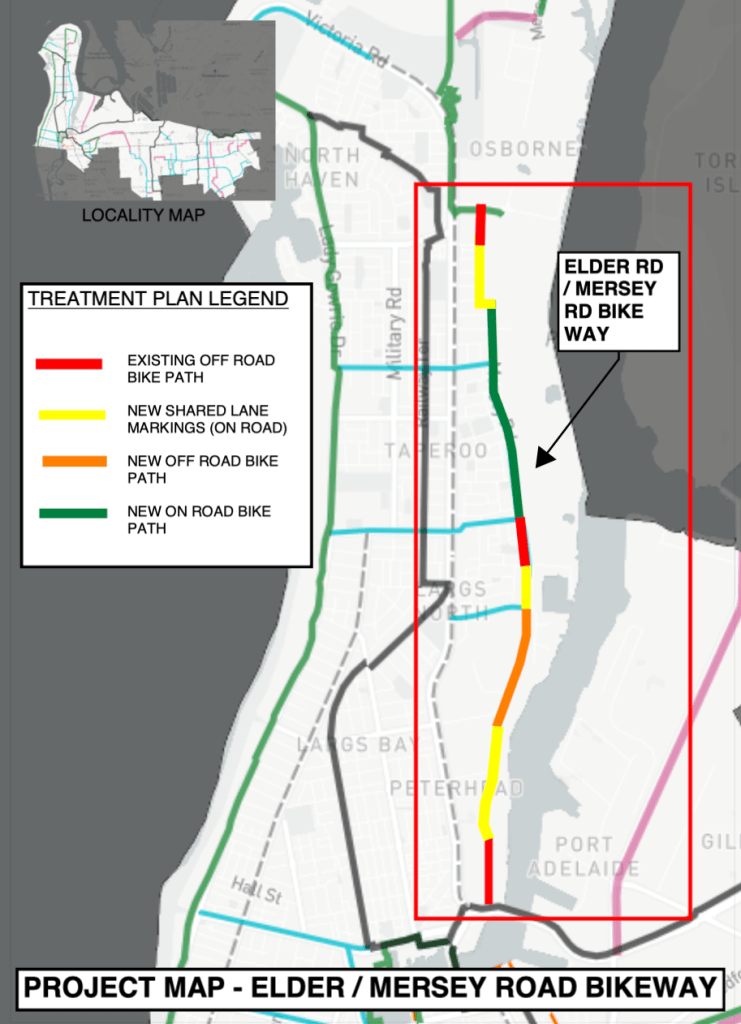 - a proposal to greatly improve the Mersey Road Bikeway route which runs northwards between Victoria Road & the Port River. The proposal would create an ‘on road’ bike way with new infrastructure along Elder Rd and Mersey Rd, running from Birkenhead to Osborne
