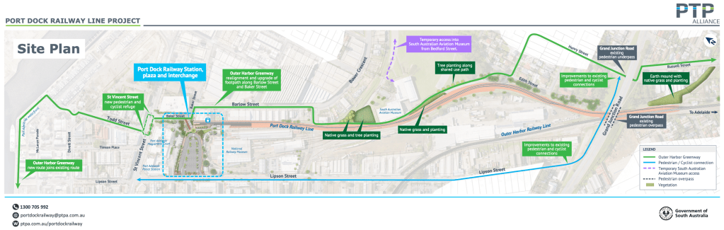 With regard to timelines & signage the Project tells us that ‘The plan is to have all detour signage in place by Thursday, 9 November 2023‘… & ‘ It will be a soft start as the Lipson Street entrance that runs across the rail line to the SA Aviation Museum will be open for a couple of weeks. However there will be construction activity around here and traffic controllers on site will encourage pedestrians and cyclist to use the detours.’ It is believed that the Project will run to about June 2024.