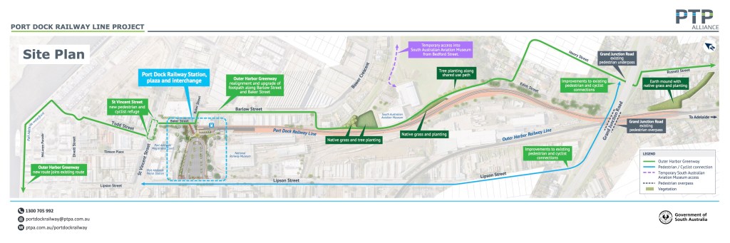 The project has provided maps of detours applying over next few weeks (until around October) & the project’s proposed final site plan (see above). Both are also available at the ptpa’s website: https://ptpa.com.au/projects/port-dock-railway-line: