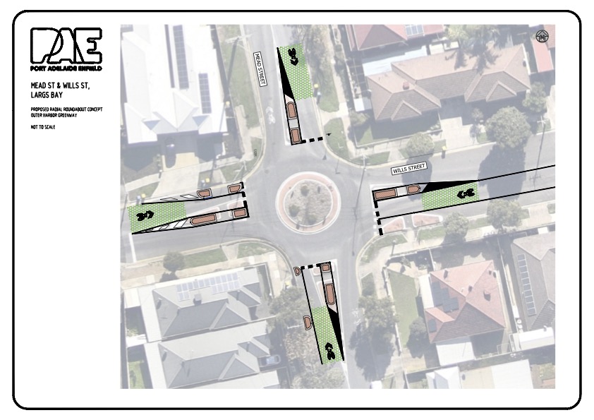 1. Mead St & Wills Street Roundabout Design: Council will shortly put out consultation for Black Spot funding proposals for the next financial year (2025/26) along the OH Greenway, including a new roundabout design for the Mead/Wills Street intersection (see below). This roundabout constitutes a key road intersection on the Northern section of the Outer Harbor Greenway. The proposal is to upgrade the existing ‘tangential’ roundabout to a ‘radial’, inspired by SA’s latest Active Travel Design Guide. It will include new patterned line marking on the approach to the roundabout in the shape of green hexagons or honeycombs. Sharrows will then be placed centrally to alert drivers of cyclists and to support cyclists to ‘claim the lane’ when entering the roundabout.