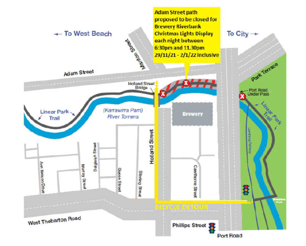 The City of Charles Sturt have provided the following notice of this proposed closure of the Torrens Linear Path to assist management of visitors viewing the Riverbank Christmas Lights: