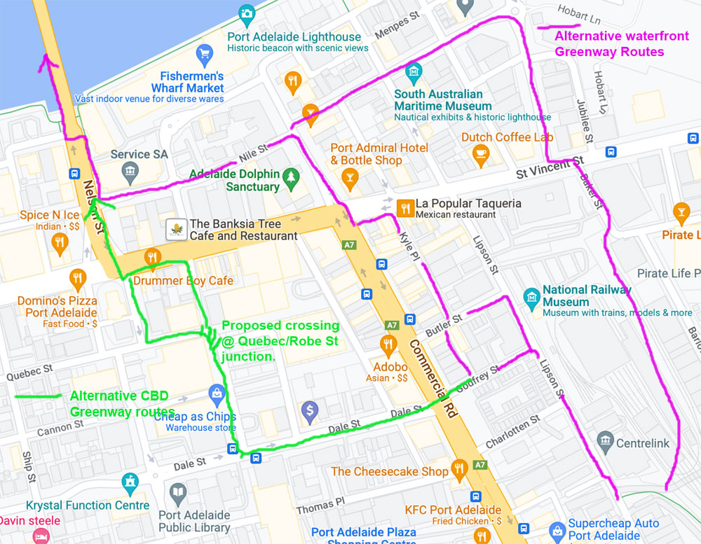 alternative routes to take the Greenway off Lipson St south & avoid the uncontrolled crossing at Commercial Rd (including possible routes via Butler & Kyle Streets across to Lighthouse Square)